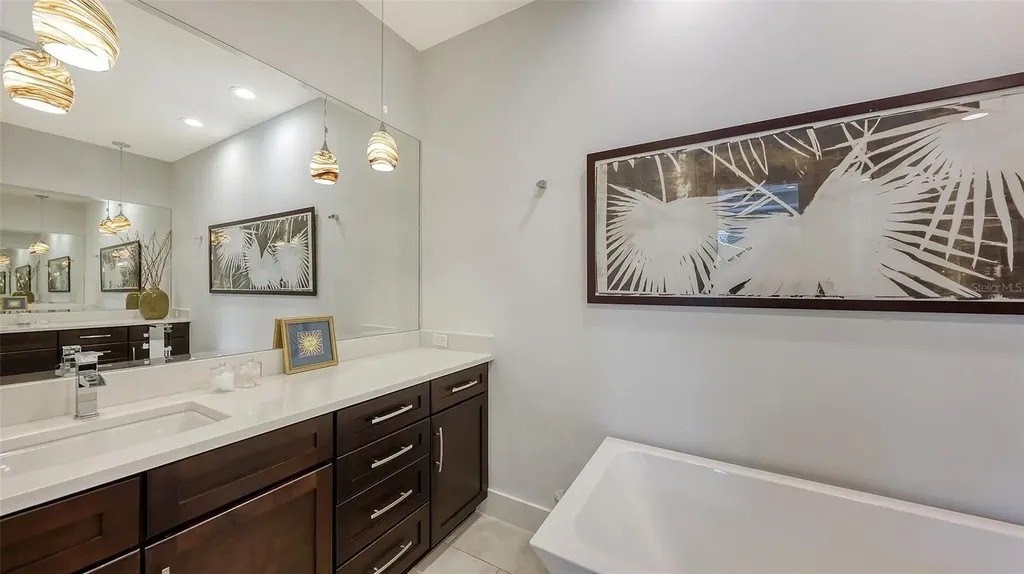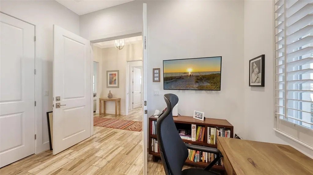 One of the newest homes in the meadows featuring 10 ft ceilings, 8 ft. Doors and sunlight filled open spacious rooms. Southern light filters through impact rated sliders and windows. A private corner lot located just steps to community pool. Screened lanai opens to tropical setting with room to add a private pool or a walled courtyard. This thoughtfully well designed home has an open kitchen with separate dining and space for entertaining in style. The main bedroom is separated and opens to a spa like bath with separate tub and shower. Tile floors throughout and freshly painted, walls woodwork and doors.full security system, Air conditioned garage with new epoxy flooring and whole house water filter. Fully owned Tesla solar panels provide abundant electricity averaging less than $30 per month year round. The perfect home with some of the lowest neighborhood fees in the meadows.Muirfield Heath is a maintenance free neighborhood Conveniently located in a community offering restaurants, golf, pickle ball, tennis, Swimming pools, state of the art workout facility and community center with activities such as yoga, wellness speakers, mahjong and Farmers market. Convenient short commute to UTC, Downtown Sarasota, Whole Foods, fresh market, Home Depot and Trader Joe's. Unique opportunity to own a newer construction home in this location.